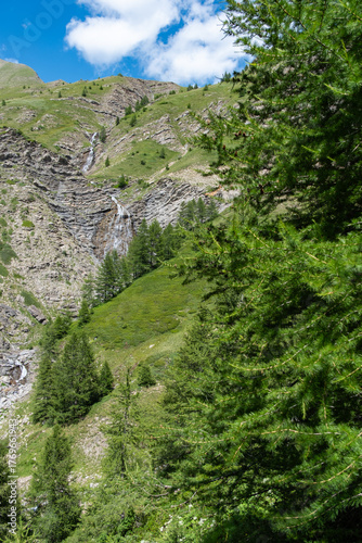 mountain landscape, tree, waterfall, blue skies, cloud, nature, scenic view, hiking, adventure, travel, tour tourism, wilderness, calmness, peaceful, serene, natural beauty, environment, environmentally friendly, summer, exploration, picturesque, idylli, fresh air, relaxation, escape, get-away, forest, alpine, highland, elevation, geology, rock formation, cascade, scenic route