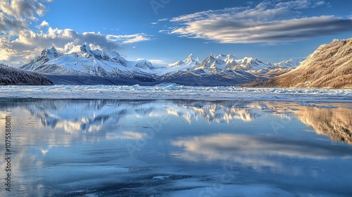 Scenic mountain range reflected in a still, icy lake.
