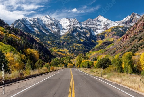 road, mountain, autumn, tree, snow, peak, sky, nature, landscape, vale, aspen, yellow, scenic, travel, destination, view, mountain, colorado, outdoors, wilderness, journey, highway, path, vista, clear, sunlight, bright, route, roadway, winding, curving, perspective, blue, foliage, fall, environment, climate, altitude, elevation, ridge, crest, summit, slope, hillside, timberland, forest, season, day