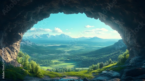 Scenic mountain vista viewed through natural rock arch window reveals dramatic cave opening, lush green valley, and distant blue mountains in majestic panoramic composition.