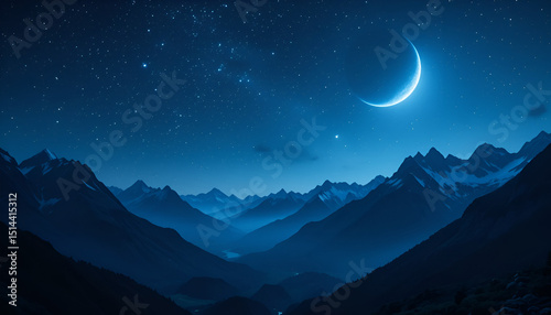 Scenic Night Sky with Crescent Moon Over Mountain Range Under Starry Sky – Serene Nature Landscape at Dusk