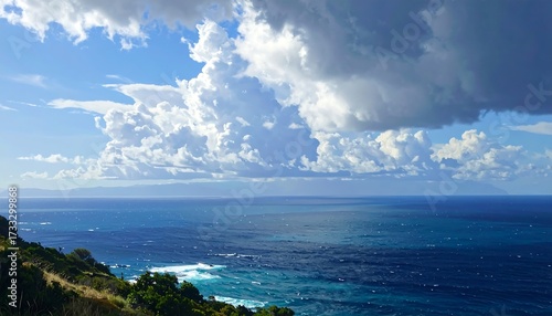 ocean, sea, cloud, sky, landscape, water, coastline, nature, island, horizon, scenic, view, seascape, blue, tropical, travel, paradise, beautiful, vacation, wave, shore, environment, summer, cloudscape, coast, hillside, greenery, tranquil, natural, formation, panorama, idylli, relaxation, picturesque, serene, sunlight, turquoise, vibrant, wilderness