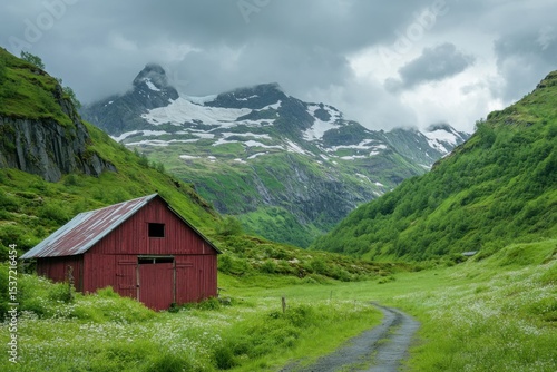 barn, red, mountain, vale, landscape, nature, norge, scenic, photo, green, grass, summer, rural, countryside, hill, cloud, sky, path, road, travel, view, beautiful, serene, calm, peaceful, idylli, wild, remote, spring, house, mountain, alps, hut, alpine, meadow, bungalow, forest, village, wood, tree, switzerland, building