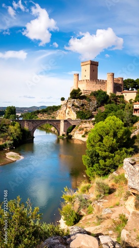 river, castle, vale, landscape, stone, bridge, water, sky, cloud, tree, green, nature, travel, historic, spain, europa, beauty, calm, peaceful, view, sunlight, rock, mountain, town, ancient, historical, tour tourism, vacation, picturesque