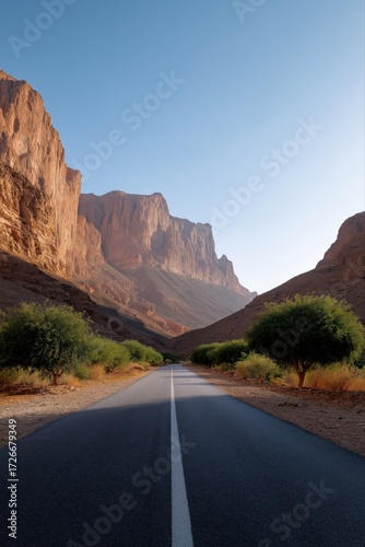 Scenic road through desert valley with majestic cliffs and clear blue sky