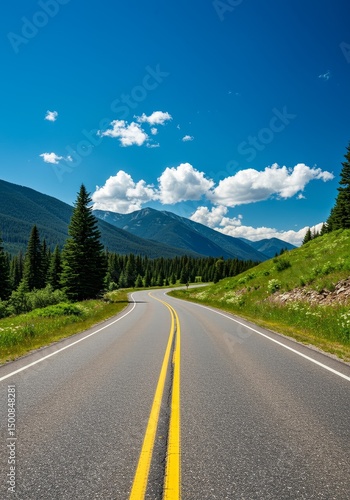 road, mountain, landscape, sky, nature, tree, green, blue, scenic, travel, asphalt, cloud, summer, view, journey, path, highway, vale, sunshine, forest, daylight, adventure, open, winding, perspective, horizon, environment, elevation, peak, rolling, terrain, wide, clear, bright, natural, season, explore, direction, destination, upward, growth, flora, ecology, ecosystem, tranquil, vibrant, peaceful, fresh