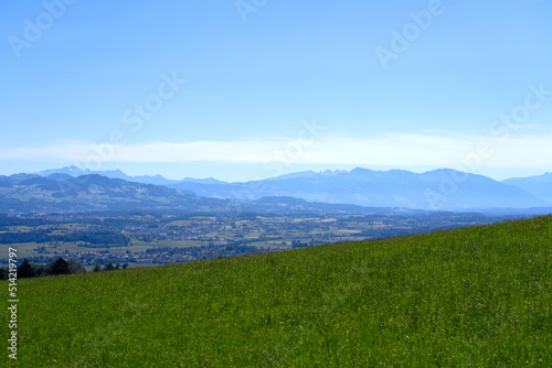 Scenic rural landscape at Forch Küsnacht with mountain panorama in the background on a sunny summer day. Photo taken June 12th, 2022, Forch Küsnacht, Switzerland.