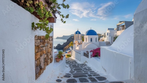 Scenic Santorini Pathway with Blue Domed Buildings