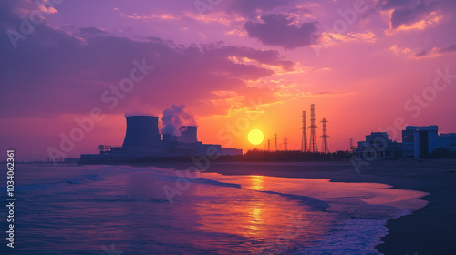 sunset, industrial, landscape, ocean, shore, power, plant, silhouette, twilight, electricity, sky, cloud, water, beach, evening, horizon, serene, peaceful, dramatic, energy, environment, coastal, scenery, colours, beautiful, nature, calmness, station, infrastructure, smokestack, transmission, gradient, dusk, sea, machinery, coastline, atmospheric, pollution, generation, structure, shoreline, sun, ship, city, river, skyline, sunrise, port