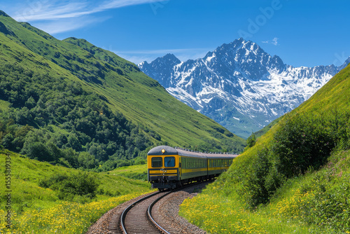 train, journey, mountain, landscape, nature, scenic, green, travel, adventure, railway, summer, blue, sky, snow, peak, hill, countryside, transportation, vibrant, beautiful, exploration, winding, track, flora, fauna, peaceful, route, picturesque, view, horizon, sunlight, bright, fresh, air, destination, vacation, tour tourism, natural, beauty, environment, alpine, meadow, greenery, wildlife, photo, mountain, range, breathtaking