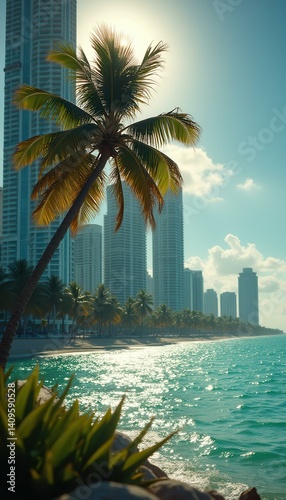 palm, tree, beach, tropical, water, ocean, sea, skyline, skyscraper, city, coastal, paradise, travel, tour tourism, vacation, sunny, bright, day, sky, blue, turquoise, sparkle, sun, sunshine, coast, shore, sandy, modern, architecture, building, nature, environment, landscape, scenic, tranquil, calm, relax, get-away, holiday
