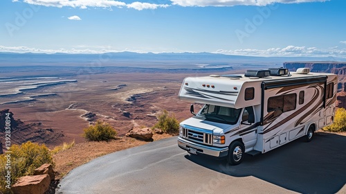 Scenic view of an RV parked on a cliff overlooking a vast desert landscape