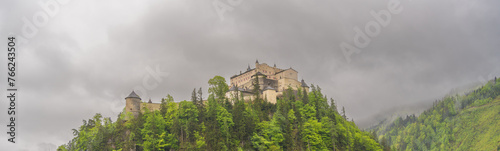 architecture, building, castle, highland, nature, plant, tree, wood, forest, austria, building exterior, color image, culture, day, environment, famous place, fog, history, horizontal, mountain, no people, outdoors, photo, summer, travel destination, weather, ancient, europa, european alps, fort, hill, local landmark, mediaeval, mountain peak, national landmark, old, palace, sky, snow, travel, vale