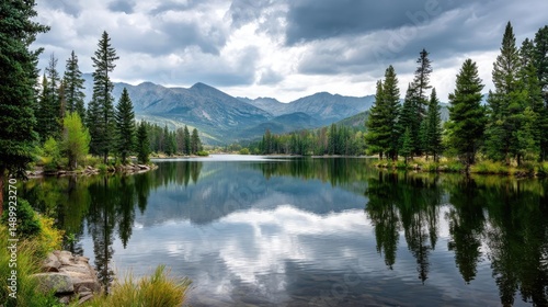 Scenic view of lake in pine forest with mountain and park concept. Serene lake reflecting mountains and trees under a cloudy sky.