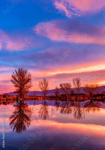 duck pond, water, tree, symmetry, sky, cloud, orange, blue, landscape, nature, scenic, beauty, idylli, majestic, travel, calmness, outdoors, sunset, nobody, no people, bishop, california, us, us