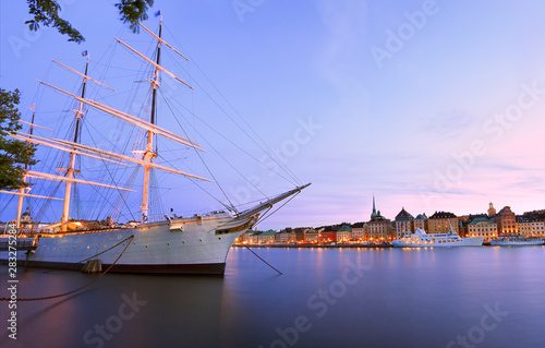 Scenic view of Stockholm's Old Town (Gamla Stan) at dusk with illuminated old ship on the foreground, Sweden