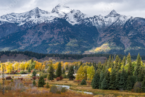 autumn, landscape, scenic, us, blue, bush, capped, cloud, daytime, distant, fall, format, grand, green, horizontal, mountain, mountain, national, park, peak, range, river, sage, sky, snake, snow, tour tourism, tree, vacation, view, white, wyoming, yellow