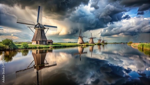 windmill, storm, wind, heavy, weather, nature, energy, power, renewable, sustainable, landscape, dramatic, cloud, grey, sky, turbine, blade, spinning, danger, force, resilience, windmill, holland, mill, holland, dutch, water, river, architecture, traditional, canal, agriculture, europa, historic, old, landmark, heritage, rural, grass, polder