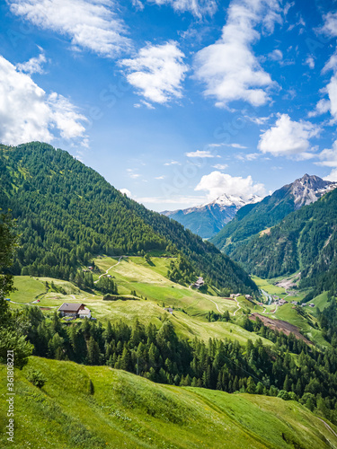 Scenic view over the Passeier Valley above Moos near Rabenstein, South Tyrol, Italy.