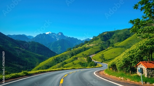 Scenic Winding Road Through Lush Green Mountains and Rolling Hills Under a Clear Blue Sky