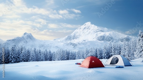Scenic Winter Camp with Tents and Majestic Snow-Capped Mountain