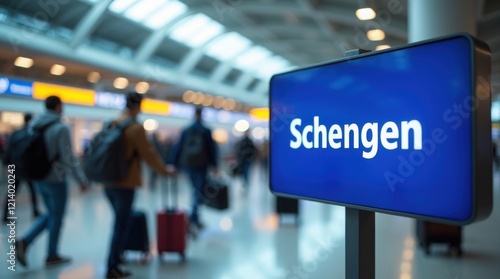 Schengen sign in an airport terminal with people walking in the background. Travel, border control, passport control themes