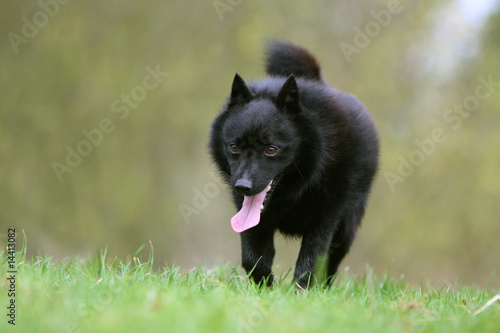 schipperke noir zin avançant de face à la campagne
