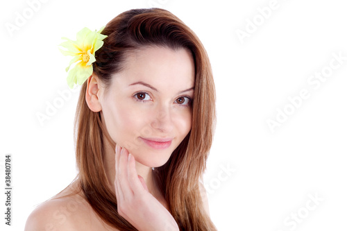 recreation, european, woman, fun, head, cosmetic, man, model, person, portrait, beauty, summer, studio, vacation, flower, flower, brunette, chill, recover, awake, adult, friendly, young, laugh, smile, girl, orange, pose, positive, quadratic, relax, ease, look, shoulder, pretty, lateral, warm, wellness, heat