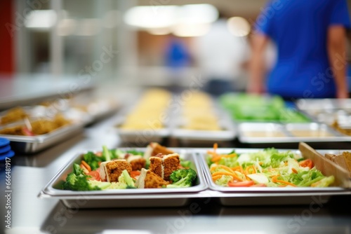 school cafeteria trays with healthy meals