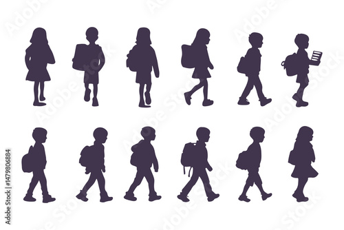 School Children Silhouettes, Kids Walking with Backpacks, Children Side Profile Silhouette, School Kids Standing and Walking, Backpack Kids Silhouettes Clipart Vector Illustration.