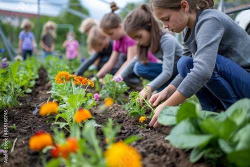 School Garden Activity: Students Planting Flowers and Vegetables for Sustainability Education