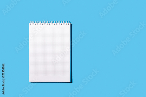 School notebook in a cage for entries on a blue background isolated view from above. Spiral notebook on the table. Design concept