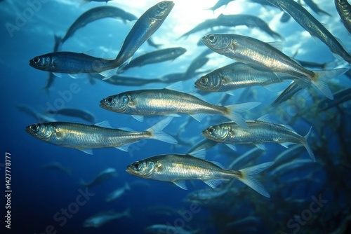School of Fish Underwater Composition of Multiple Silverfish, Sunlight Backlighting, Aquatic Concept, Fish Swarm Keyword1 underwater photography Keyword2 marine life