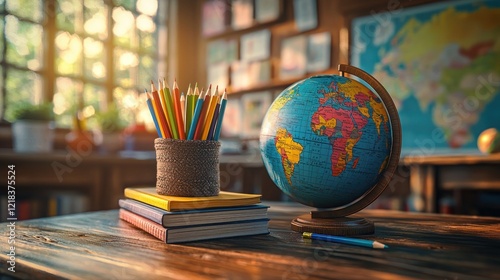 school, education, desk, supply, map, classroom, book, globe, learning, study, wooden, teacher, student, cognition, material, colourful, table, geography, interior, background, object, stack, container, colours, place, arrangement, stationery, collection, bright, nobody, indoor, closeup, view, design, concept, sharpened, still, equipment, structure, illustration, classroom, resource, earth, graphic, tutorial, project, homework