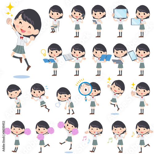 woman, student, shirt, summer, uniform, school, people, smile, seated, chair, smartphone, tablet, cyberspace, privacy, communicate, announcement, book, noto, study, acquaintance, bow, japan, greeting, run, fast, rush, drop, sigh, fatigue, magnifying glass, discovery, magnifying, jump, rejoice, ok, gesture, approval, cheer, song, music, karaoke, dance, pursuit, set, illustration