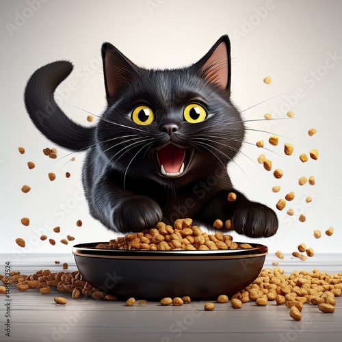 Schwarze Katze boxt den Napf um – Futter fliegt