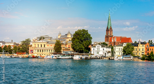 Schweriner Dom mit dem Marstall und dem Schiffsanleger der Weissen Flotte
