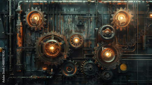Sci Fi Grunge Modern Clean background with a dark, industrial aesthetic, featuring large gears, pipes, and illuminated control panels.