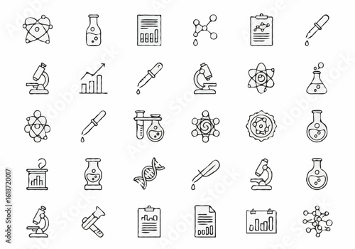 icon, line, outline, vector, symbol, signs, chemistry, laboratory, business, illustration, design, simple, thin, modern, atom, molecular, flask, beaker, microscope, deoxyribonucleic acid, dropper, chart, graph, report, document, element, linear, technology, analysis, biology, physics, chemical, experiment, medicals, pharmacy, education, school, study, test tube, discovery, growth, clipboard, isolated, black, white, editable, web, collection