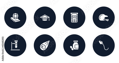 science filled icons set. flat filled icons sheet included politics, graduation hat, scientific calculator, baseball helmet, biochemistry, meteor, medicines, spermatozoon vector.