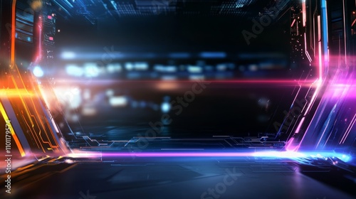 scientific fiction fantasy futuristic background, shiny light glowing on dark background with geometric shape bokeh and neon light trail