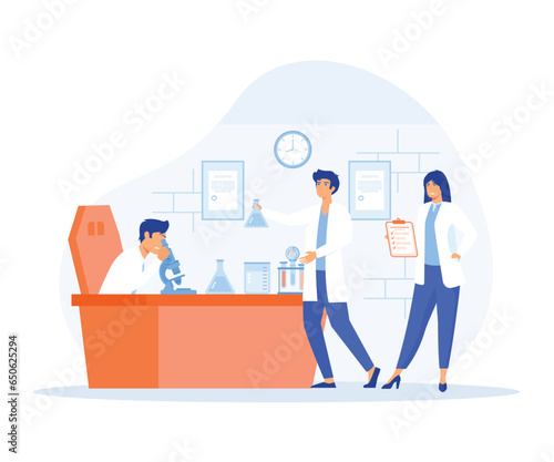 Scientific research concept, two men and woman working at science lab. Laboratory interior, equipment and lab glassware. flat vector modern illustration