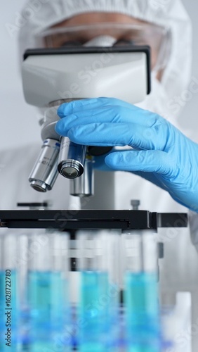Scientific researcher or virologist wearing protective gear adjusting microscope, analyzing lab samples with precision in sterile research environment. Medicine and science concept