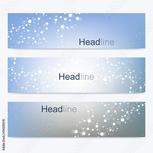 Scientific set of modern vector banners. DNA molecule structure with connected lines and dots. Science vector background. Medical, tecnology, chemistry design.