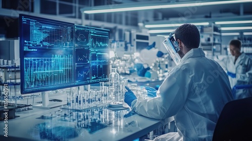 science, laboratory, research, technology, scientist, datum, analysis, computer, screen, monitor, laboratory, experiment, testing, innovation, future, development, medicine, health care, chemistry, biology, engineering, pharmaceutical, industry, manufacturing, men at work, team, professional, equipment, goggles, protective, gear, clean, modern, sterile, digital, information, progress, discovery, solution, investigation, precision, diagnostic