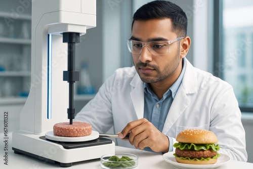 Scientist analyzing lab-grown meat patty texture with precision tool in laboratory setting, concept of food innovation and research science background. Ai generative