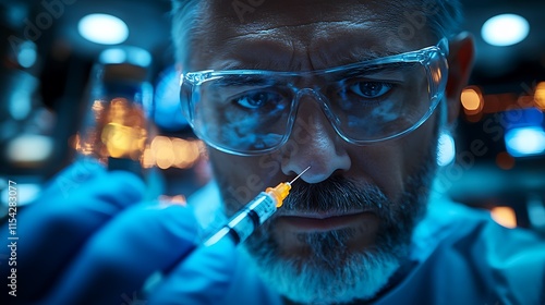 scientist, laboratory, syringe, research, medicals, science, experiment, researcher, laboratory, glove, goggles, man, blue, light, sharpened, closeup, injection, health care, technology, medicine, professional, expert, work, investigation, discovery, analysis, precision, careful, concentration, detail, observation, experimentation, accuracy, testing, equipment, procedure, process, solution, study, development, innovation, progress