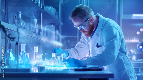scientist, laboratory, experiment, beaker, glassware, liquid, mixing, chemistry, research, evening, blue, light, technology, innovation, glove, test, tube, ampoule, equipment, science, reaction, bubbling, observation, professional, discovery, analysis, study, working, fluorescent, glasses, advanced, safety, goggles, chemical, experimenting, solution, datum, environment, investigation, academic, medicals, academe, precise, finding, background, bright, colours, modern