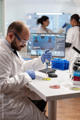 Scientist doing genetic experiment using blood sample on micropipette dropped on petri dish. Team of researchers examining virus evolution using high tech for vaccine development.
