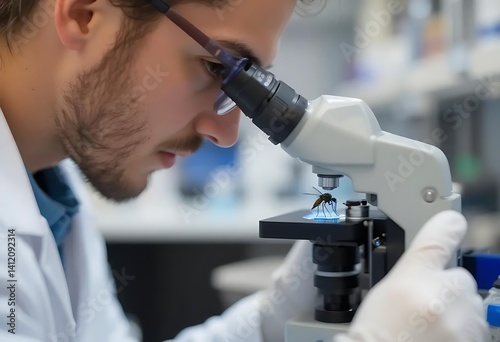 Scientist Examining Insect Under Microscope: A Close-Up Study